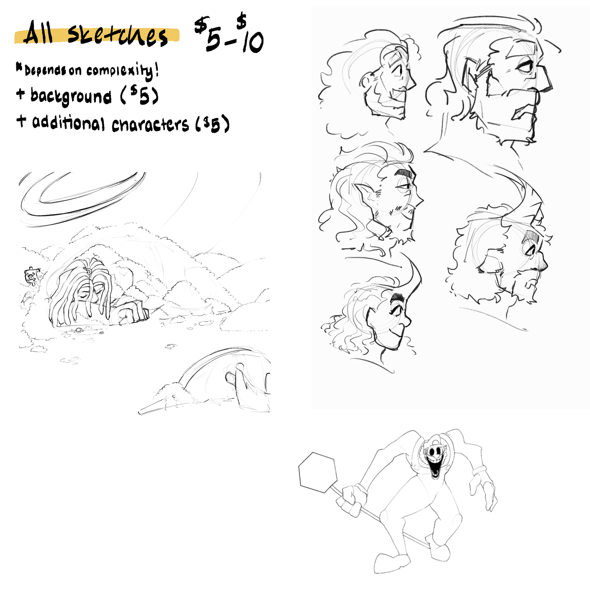 These commissions are quick and can have clean/roughish line-art. The sketch can have simple shading and greyscale for free.