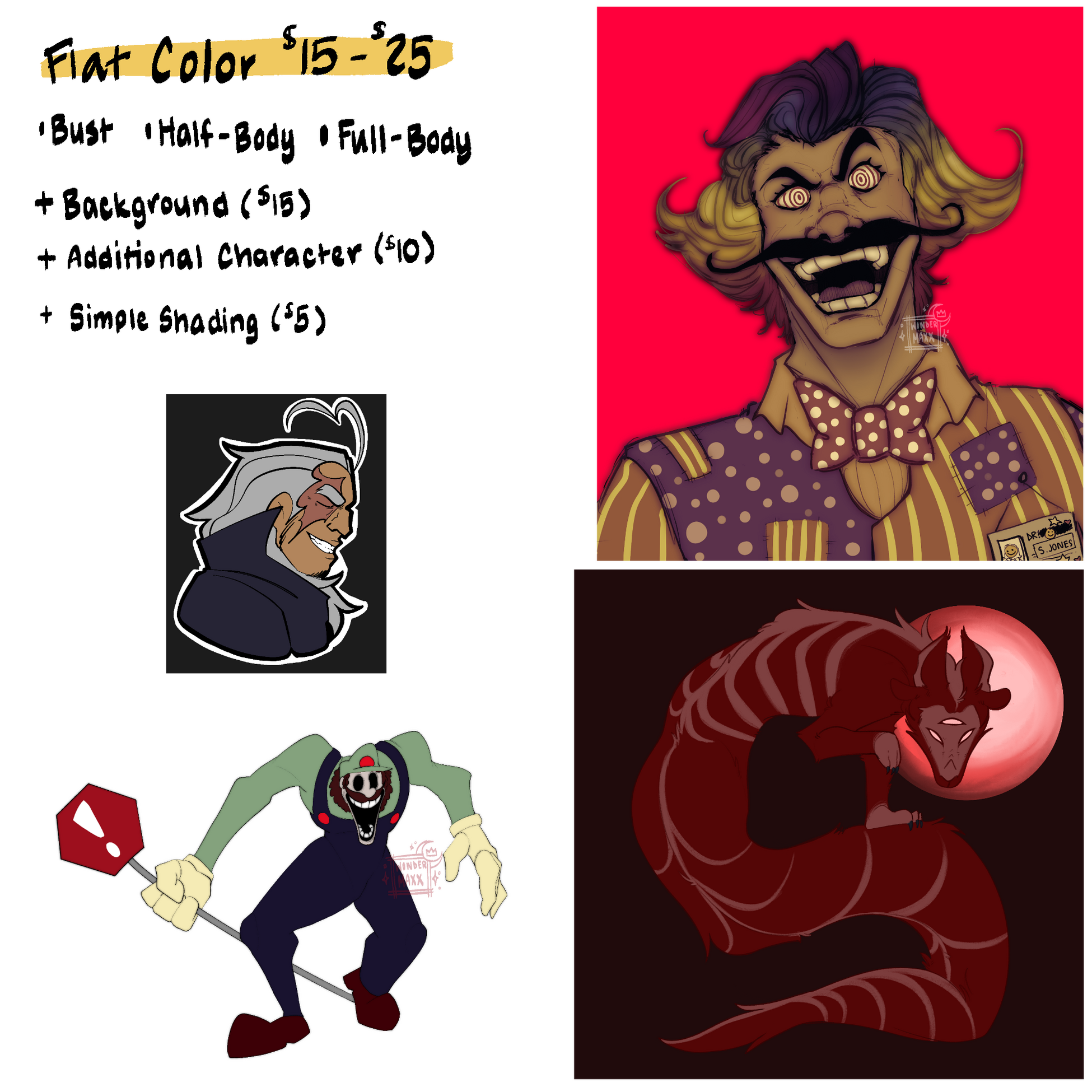 These commissions are of clean line-art (or roughish if you'd like!), and simple shading.