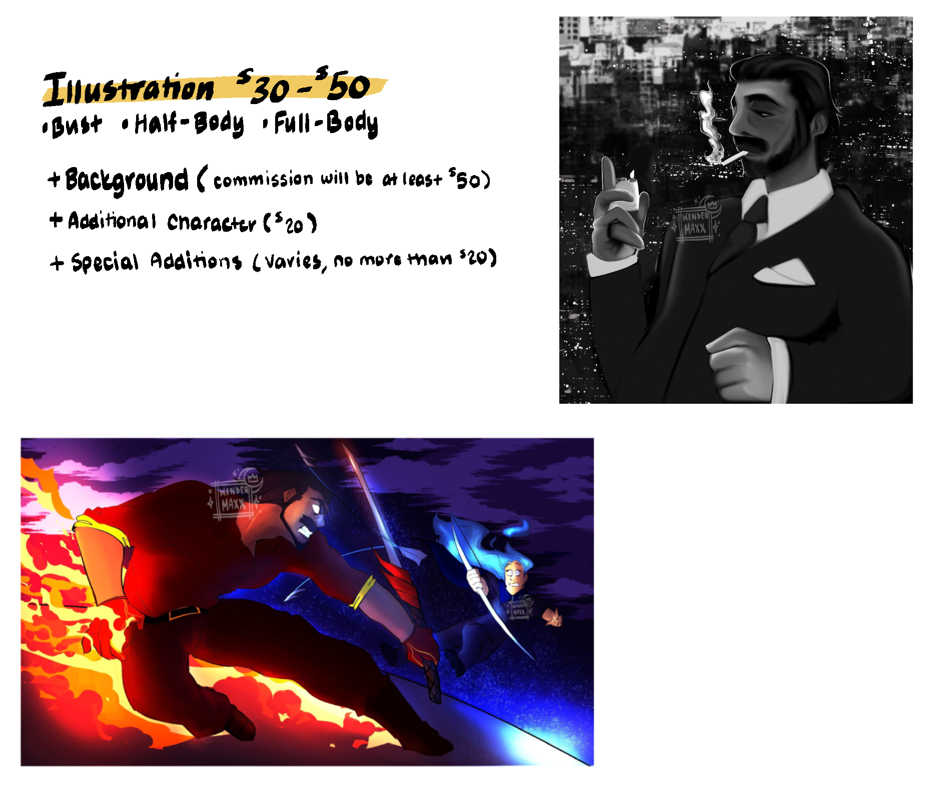 These commissions are my most detailed! They could range from calm and serene to bloody and dramatic!! These commissions come with painting-like shading and the option of backgrounds, additional characters, scenes, and more!